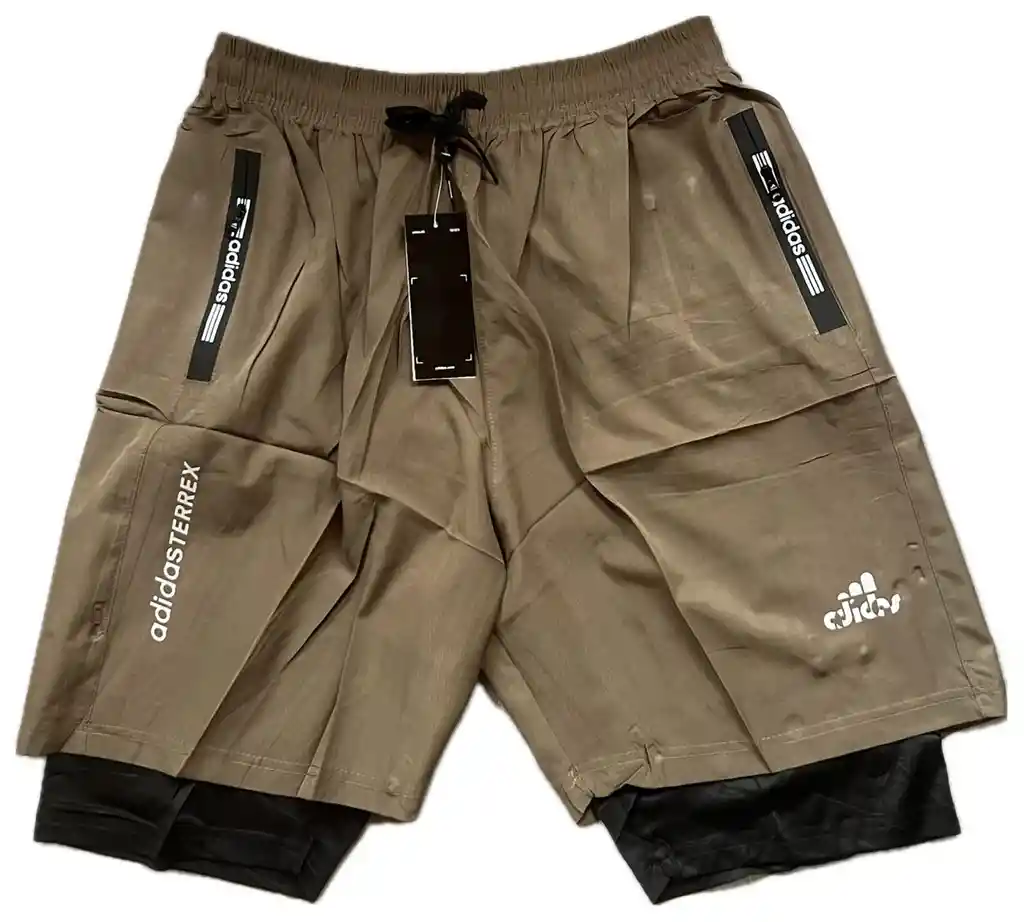 Pantaloneta deportiva hombre, material impermeable con licra interior, cremallera en los bolsillos color marrón, talla XL.