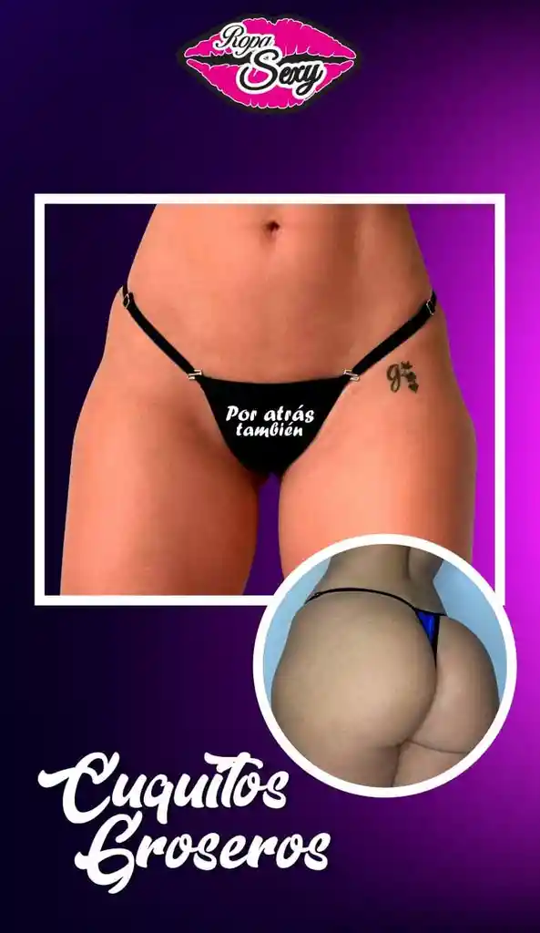 Sexy tanga con broches ajustables y mensajes erótico " Por Atrás También ".