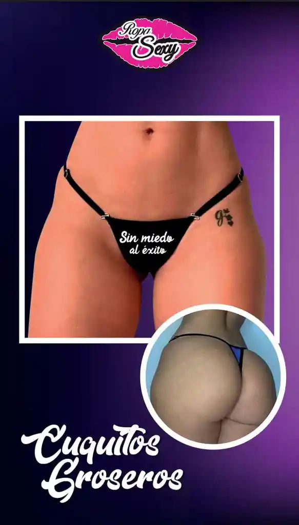 Sexy tanga con broches ajustables y mensaje erótico " Sin Miedo Al Exito ".
