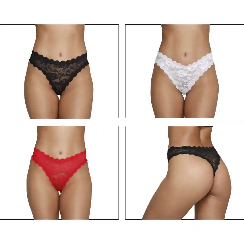 Pantys elaborados en delicada blonda y fino encaje. Kit x3 en colores negro, blanco y rojo talla M. Industria 100% Colombiana. Envíos con total discreción