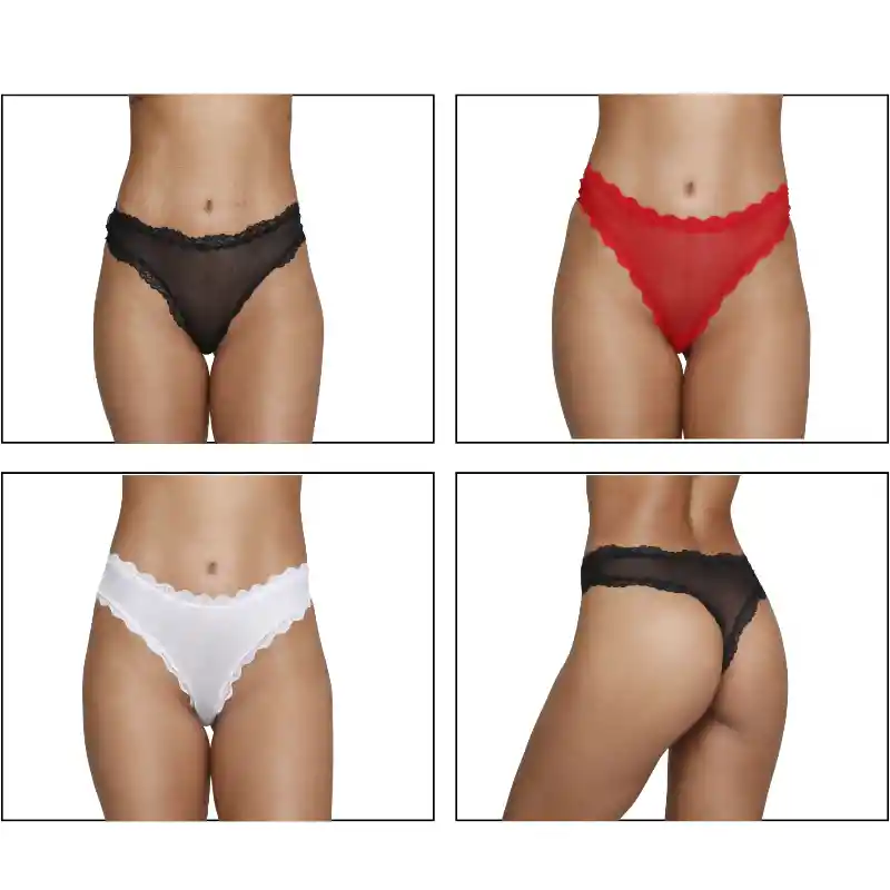 Pantys elaborados en tull mallatex transparencia y delicado encaje. Kit x3 en colores negro, blanco y rojo talla XL. Industria 100% Colombiana. Envíos con total discreción