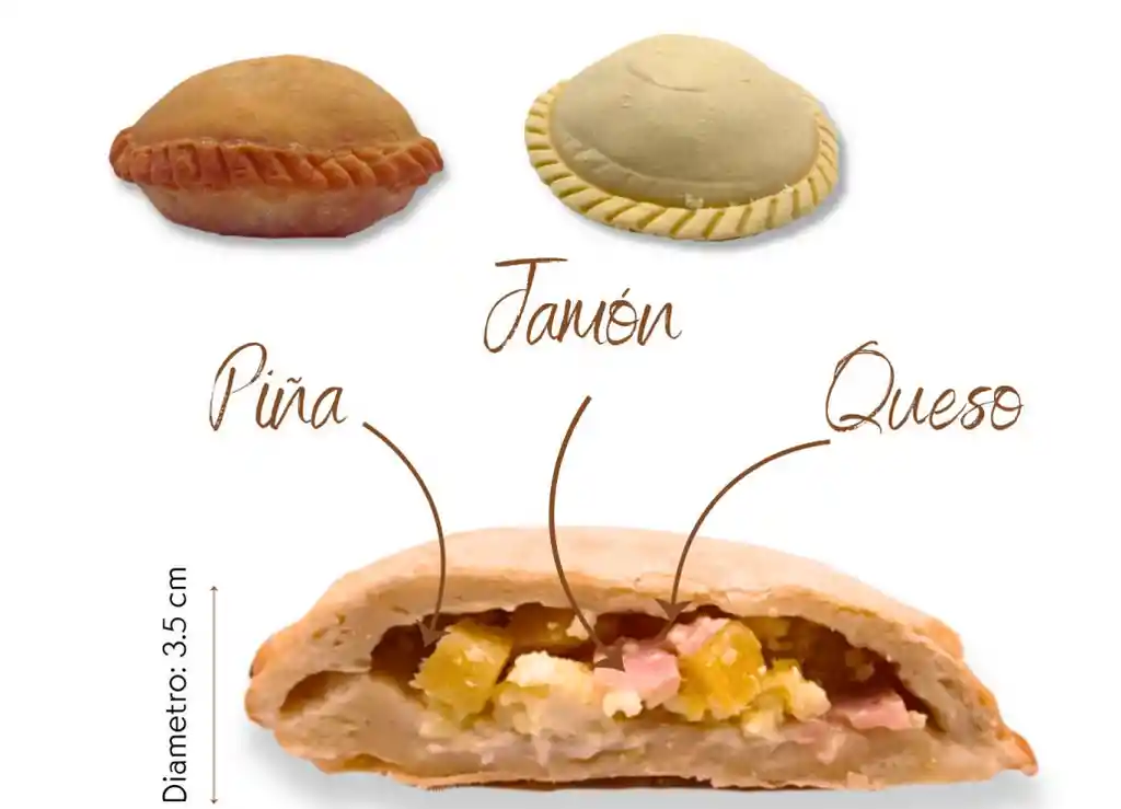 "Largo: 15 cm Diámetro: 3.5 cm Queso: campesino Relleno: piña y jamón Peso: 135 gr x und Unidades por embalaje: 5 Atemperar: Sí Temperatura Horneado: 180 ° Tiempo:5 a 7 minutos"