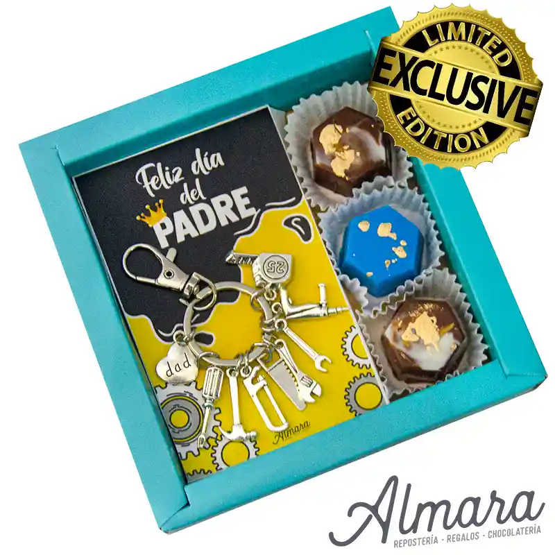 Caja de regalo agua marina 10,5*10,5*3 cm 3 Bombones de chocolate rellenos 1 llavero colgante temàtico dìa del padre 8 herramientas y corazòn Dad Esta opciòn es una ediciòn limitada no se garantiza disponibilidad una vez se acabe el inventario y solo se reserva despues del pago. Almara, chocolates, padre, desayuno, algo, bombones