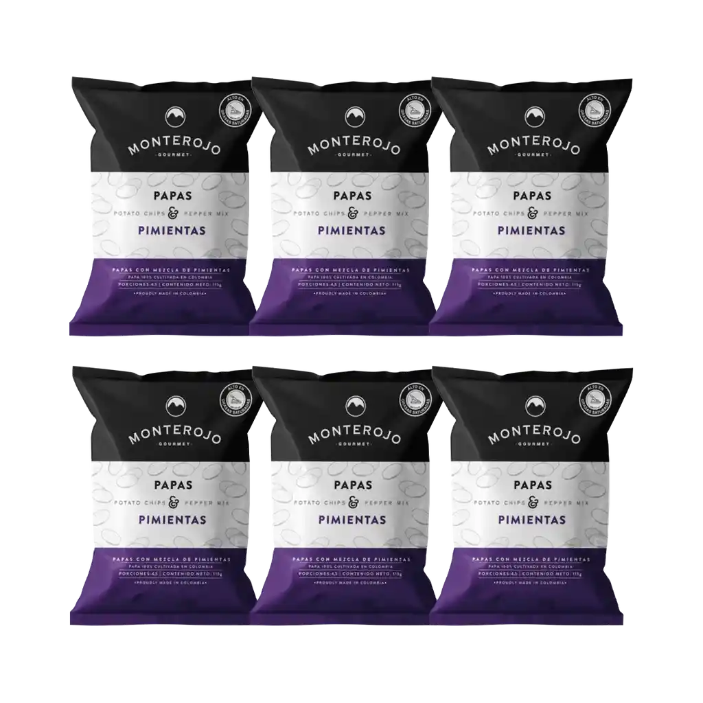 Irresistibles chips crocantes de papas gruesas y rústicas con una combinación de pimientas verde, roja, negra y blanca que las hace únicas y exquisitas. Sin gluten, sin colesterol y sin grasas trans. Ideas para combinar: Pasabocas, sánduches, hamburguesas, entre otros. Presentación: Bolsa x6 unidades de 25gr