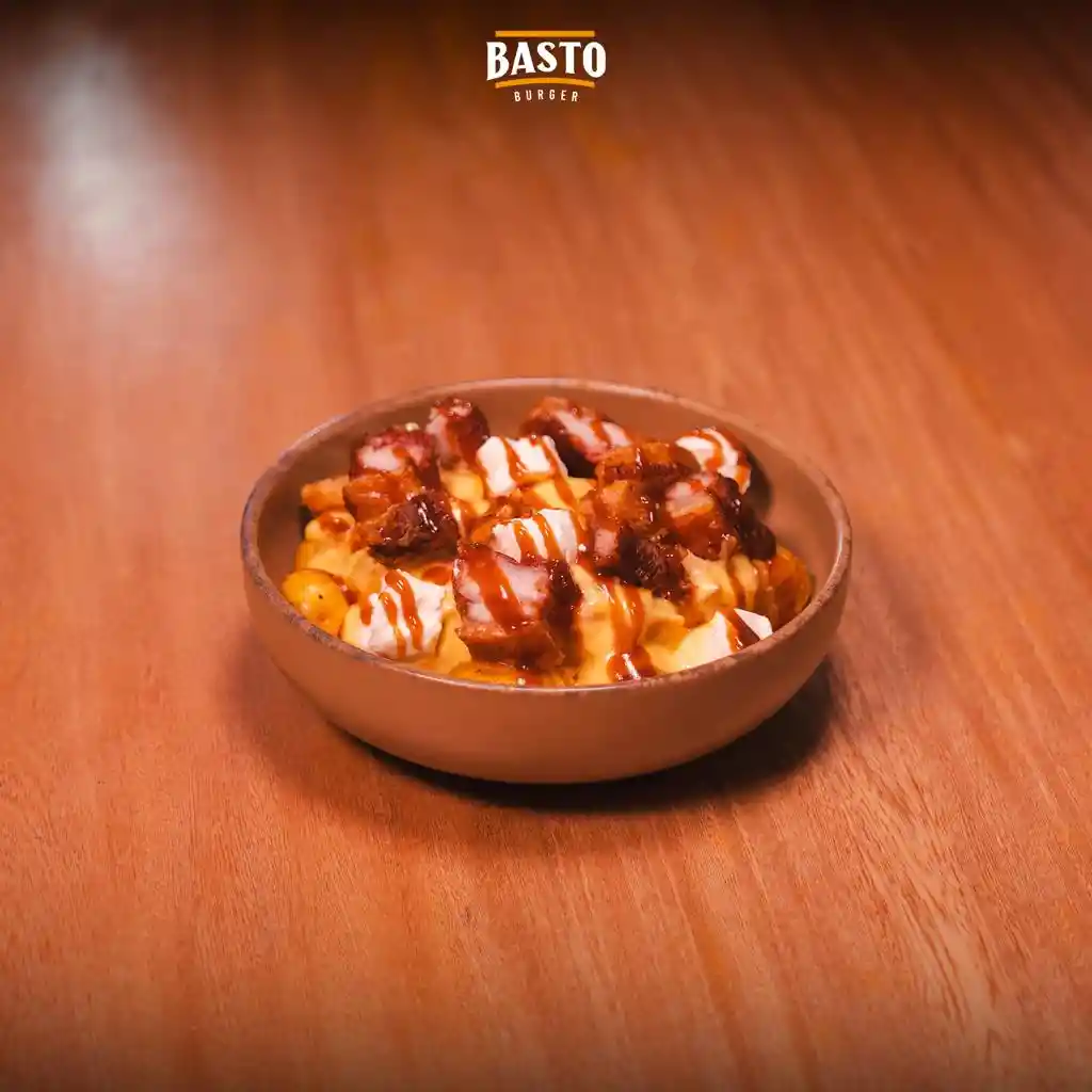 300gr de mix de papa rustic y criolla, bañadas en queso cheddar fundido con tocineta, queso philadelphia y chicharrón ahumado.