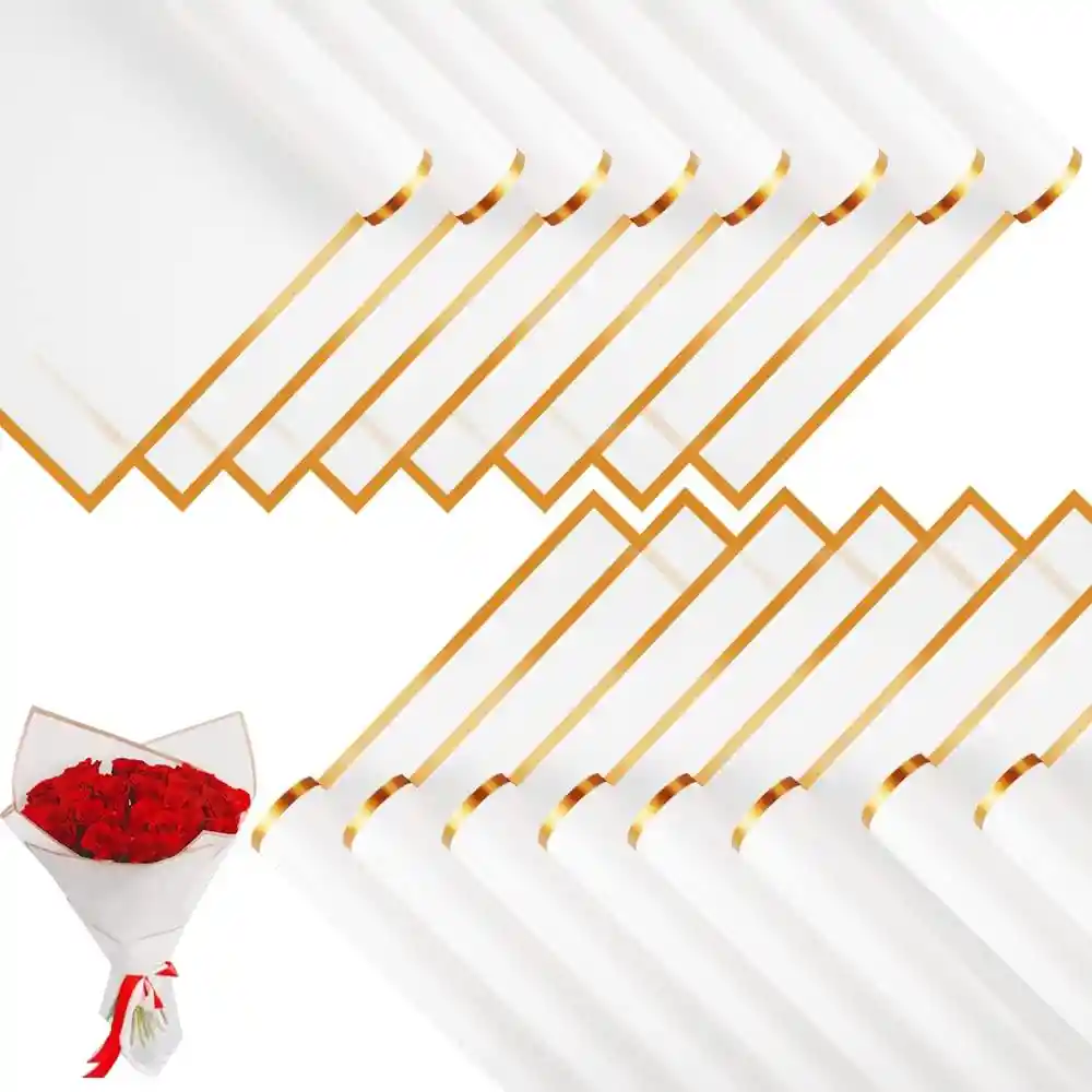 Papel Coreano transparente borde dorado 20 Pliegos para Arreglos Flores Ramos Impermeable: Estos papeles para envolver flores están hechos de materiales impermeables de alta calidad, tienen buena tensión, no se rompen fácilmente, no se preocupe por el agua al envolver flores. Tamaño perfecto: Aproximadamente 58 x 58 cm/22,8 x 22,8 pulgadas, una hoja es ideal para un ramo, no es necesario perder tiempo cortándola cuando la empaqueta. Estilo elegante: El papel de regalo impermeable está rodeado por un borde dorado, diseñado en estilo translúcido, con un aspecto esmerilado, fácil de combinar con varias flores. Ampliamente aplicable: Las hojas de papel para envolver flores son adecuadas para cumpleaños, día de San Valentín, baby shower, felicitaciones, bodas, día de la madre, embalaje de regalos y embalaje de flores navideñas, imprescindibles para las floristerías También bonitas decoraciones para la escuela, proyectos de manualidades y otras actividades artísticas.