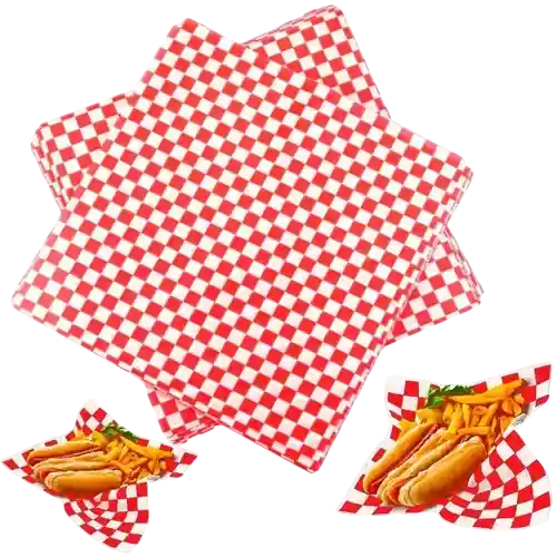 Hojas de Papel Encerado. Color: Cuadros Blancos y Rojos. Cantidad: 100 Hojas. Tamaño: 30 cm largo x 30 cm de ancho. Funciona como forro de cesta o envoltorio. Puedes utilizar el papel deli de una multitud de formas, canastas de pan, envolver sándwiches, utilizarlo como un mantel individual, o incluso utilizarlo como base en las bandejas para preparar caramelos o galletas sin hornear.