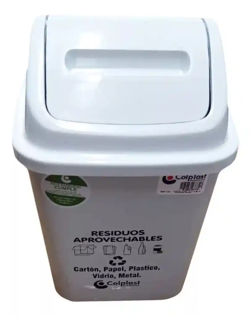 PAPELERA DE 10 LITROS TAPA VAIVÉN COLOR BLANCO CARACTERÍSTICAS: -Caneca plástica nueva de capacidad 10 litros -Material polietileno -Canecas marcadas con tipo de residuo a depositar -Tapa de vaivén -Marca Colplast -Peso 0.44 kgs -Medidas: Alto 34 cm, Ancho 22 cm, Largo 22 cm CONTENIDO DE LA COMPRA: Una papelera de 10 litros tapa vaivén color blanco
