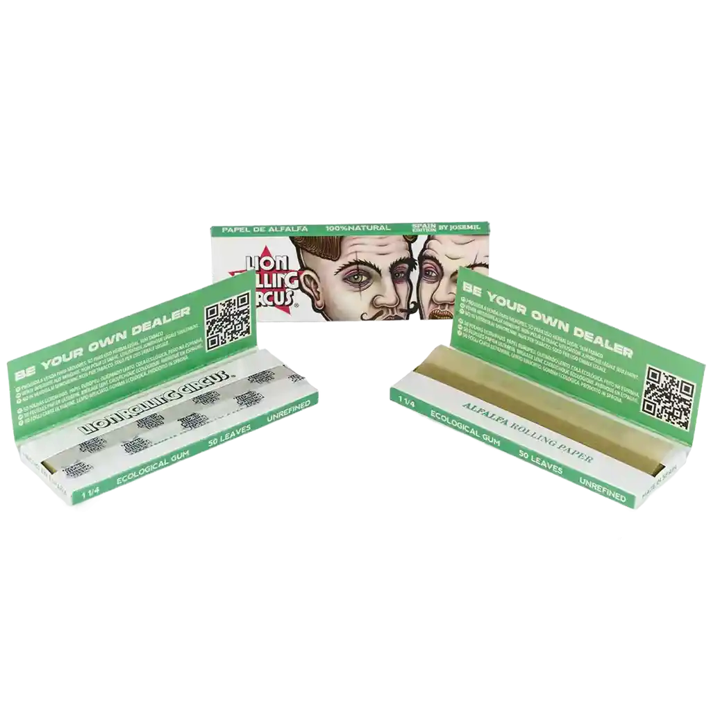 Descubre el papel alfalfa de Lion Rolling Circus, elaborado con fibra de madera 100% natural. Este papel obtiene su distintivo color verde de la clorofila extraída de la planta de la alfalfa. Certificado por FSC, garantizando que la materia prima proviene de bosques gestionados de manera sostenible. Ideal para aquellos que buscan una experiencia de fumar natural y ecológica. El papel alfalfa está disponible en dos tamaños: King Size: 110 mm, contiene 32 hojas por paquete. Perfecto para una fumada prolongada. Regular 1.1/4: 78 mm, contiene 50 hojas por paquete. Ideal para una fumada más corta y controlada. Ambos tamaños utilizan goma ecológica, asegurando una experiencia de fumar respetuosa con el medio ambiente. Características Especiales: Material: Fibra de madera 100% natural Color: Verde de la clorofila de alfalfa Certificación: FSC, de bosques sostenibles Tamaños Disponibles: King Tamaño: 110 mm, 32 hojas Regular: 78 mm, 50 hojas Goma: Ecológica Elige papel alfalfa Lion Rolling Circus para una fumada natural, sostenible y llena de estilo. Disfruta de una experiencia auténtica y ecológica con cada hoja.