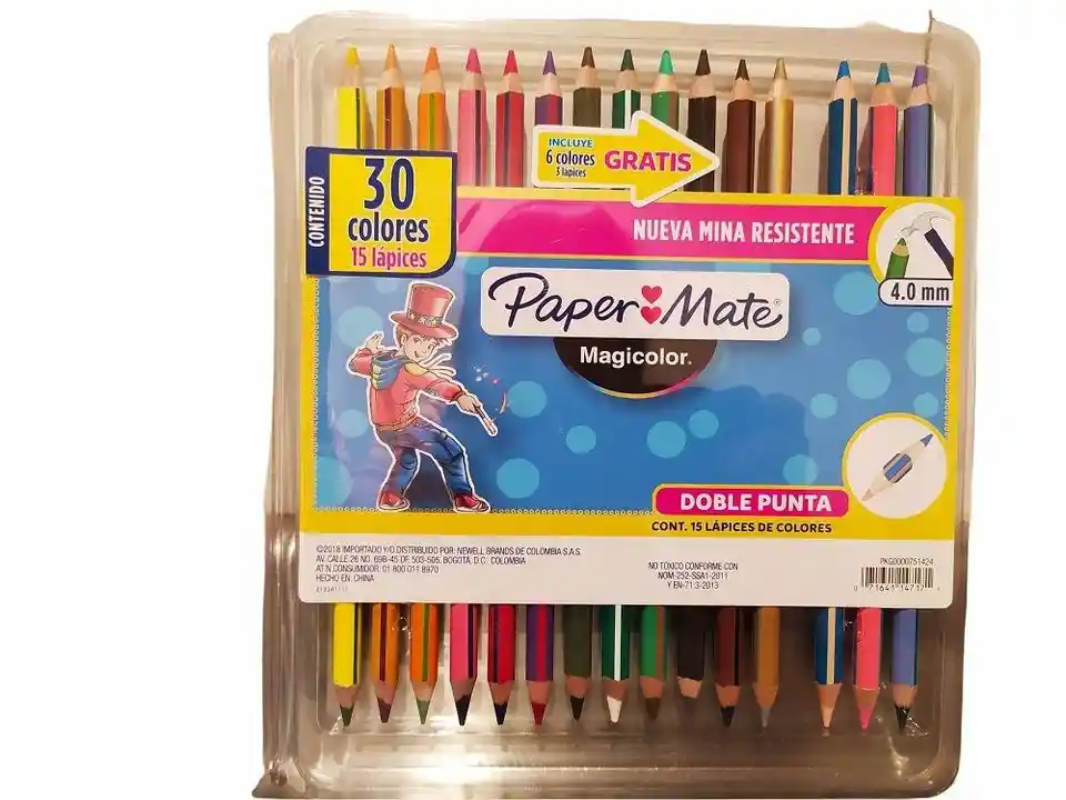 Caja De Colores Doble Punta Paper Mate 15 Lápices, 30 colores Modelo: Magicolor Doble Punta Materiales de calidad: elaborado en madera, cuenta con una mina resistente de 4.0 mm con máxima suavidad por su alto contenido en cera. Características: Colores Brillantes. Su mina aporta mayor resistencia. Caja de 15 lápices, 30 colores doble punta. Recomendados para niños mayores de 3 años.