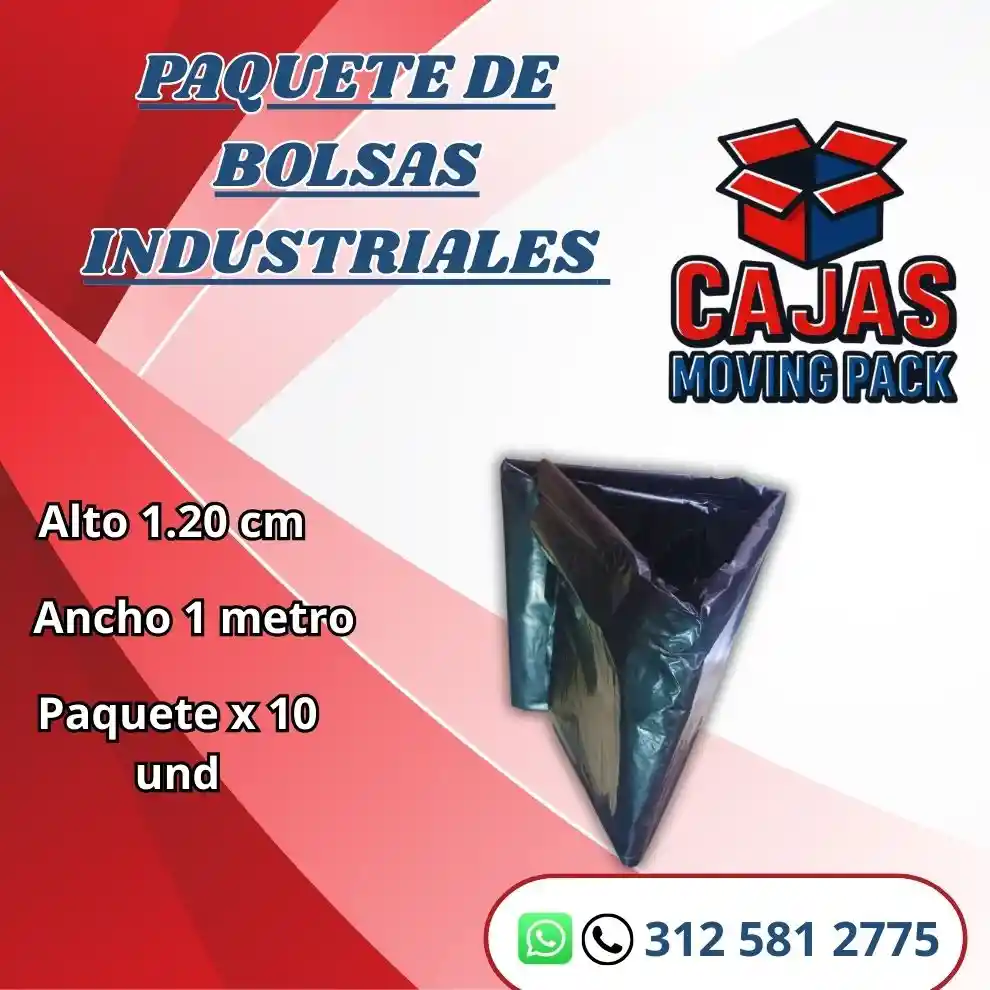 * Las bolsas industriales son ideales para mudanzas, trasteos o acarreos que requieren una solución fácil y rápida para empacar ropa, tendidos, zapatos y más. * Resistencia: Las bolsas industriales están hechas de materiales resistentes a golpes, impactos y situaciones químicas y térmicas. * Paquete de bolsas por 10 unidades. * Tamaño 1 mtr de Alto x 1,20 de Ancho * Calidad Garantizada Contáctanos: 3125812775