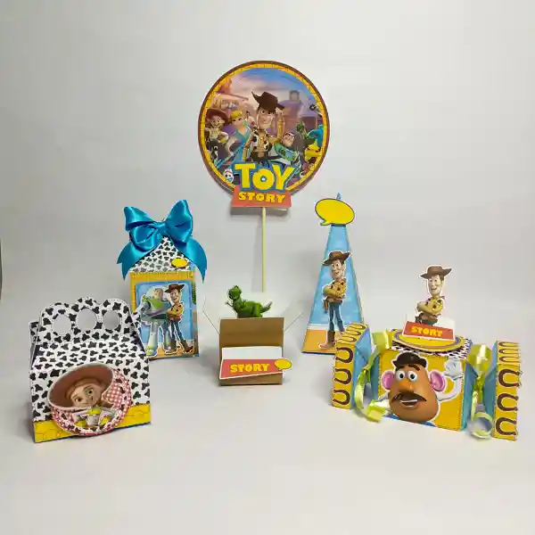 Topper toy story , 4 cajas milk box, 6 cajas prinamide , 6 cajas lonchera, 3 cajas de juguete mini, 4 cajas confetti