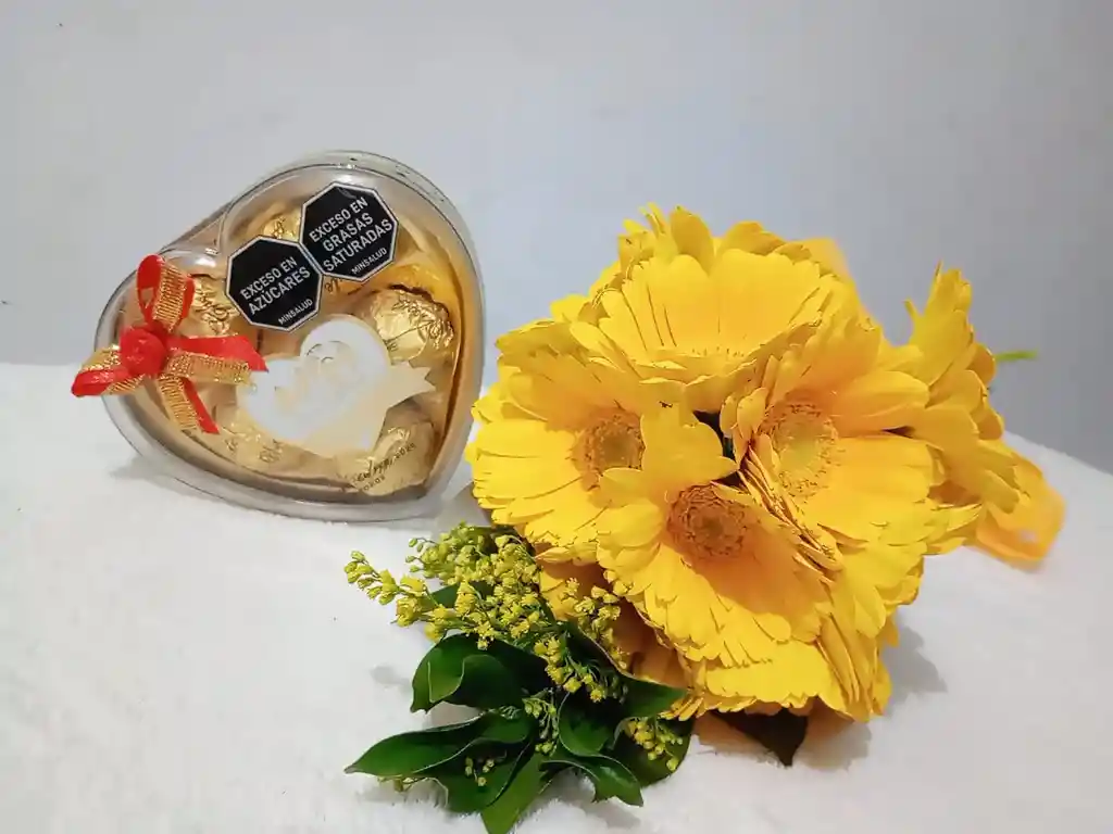 Paquete gerbera amarilla por 10 unidades tipo exportación, con follaje y envoltura decorativa con chocolates por 5 unidades. El mejor detalle para cualquier ocasión, incluye tarjeta personalizada con el mensaje que desees (escribir en el chat).