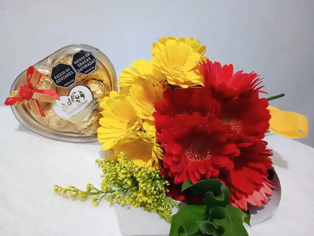Paquete gerbera surtida por 10 unidades tipo exportación, con follaje y envoltura decorativa con chocolates por 5 unidades. El mejor detalle para cualquier ocasión, incluye tarjeta personalizada con el mensaje que desees (escribir en el chat).