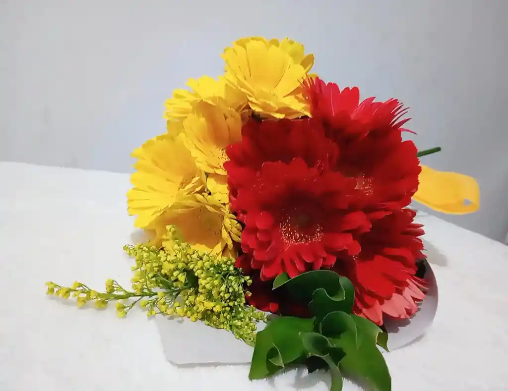 Paquete gerbera surtida por 10 unidades tipo exportación, con follaje y envoltura decorativa. El mejor detalle para cualquier ocasión, incluye tarjeta personalizada con el mensaje que desees (escribir en el chat).