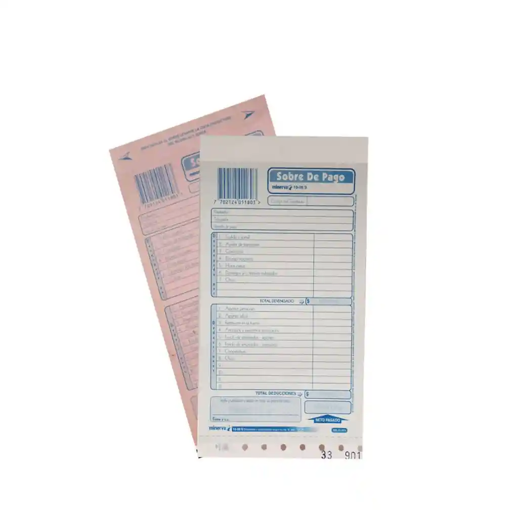 Entrega de manera confidencial a cada empleado al final de cada período de pago, proporcionándoles un registro detallado de su compensación y facilitando la transparencia en las transacciones financieras entre la empresa y sus trabajadores. CARACTERÍSTICAS Formato con copia Diligenciamiento práctico CONTENIDO PAQUETE X 50 UND DE SOBRE DE PAGO NOMINA MINERVA