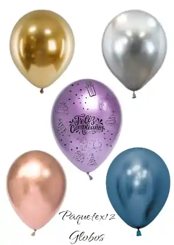 Paquete x 12 Globos R12 Cromados Surtidos Hermosos Globos Cromados para decorar tus espacios motivo FELIZ CUMPLEAÑOS. El paquete viene surtido Colores verdaderamente vivos y reflectivos con una forma increíblemente única.