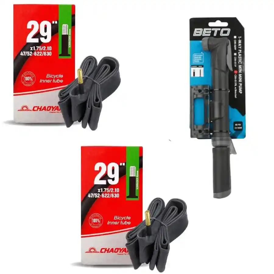 it Par de Neumáticos + Minibomba para Bicicleta Este práctico kit incluye un par de neumáticos MOLDED 29 x 1.75 / 2.10 con válvula AV de 48 mm junto con una minibomba BETO CRH-011PB, ideal para ciclistas que buscan rendimiento, seguridad y comodidad en cada recorrido. Los neumáticos están diseñados para bicicletas de rin 29, ofreciendo buena tracción, estabilidad y resistencia al desgaste, lo que los hace perfectos para uso urbano o rutas recreativas. Su medida permite un excelente equilibrio entre agarre y velocidad. La minibomba BETO CRH-011PB es compacta, liviana y fácil de transportar, permitiendo inflar las llantas rápidamente en cualquier momento. Es ideal para llevar en la bicicleta o en la mochila durante tus salidas. Características: Par de neumáticos MOLDED para bicicleta rin 29 Medida: 29 x 1.75 / 2.10 Válvula AV (tipo carro) de 48 mm Incluye minibomba BETO CRH-011PB Bomba portátil, ligera y fácil de usar Ideal para ciclismo urbano o recreativo Un kit práctico y funcional para mantener tu bicicleta siempre lista para rodar. 🚴♂️