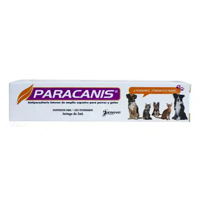 PARACANIS JGA x 5 mL Descripción: PARACANIS JGA es un antiparasitario oral de amplio espectro formulado para perros. Su combinación de principios activos permite la eliminación efectiva de nematodos y cestodos, protegiendo la salud intestinal de la mascota. Composición: Ivermectina Praziquantel Excipientes Indicaciones: Eliminación de parásitos gastrointestinales en perros. Control y tratamiento de infestaciones por nematodos y cestodos. Modo de uso: Administración oral mediante jeringa dosificadora. La dosis debe ajustarse según el peso del perro y bajo supervisión veterinaria. Precauciones: Uso exclusivo en perros. Evitar en razas sensibles a la ivermectina (como Collies y sus cruces) sin supervisión veterinaria. Mantener en un lugar fresco y seco, fuera del alcance de los niños. Presentación: Jeringa precargada con 5 mL de suspensión oral.