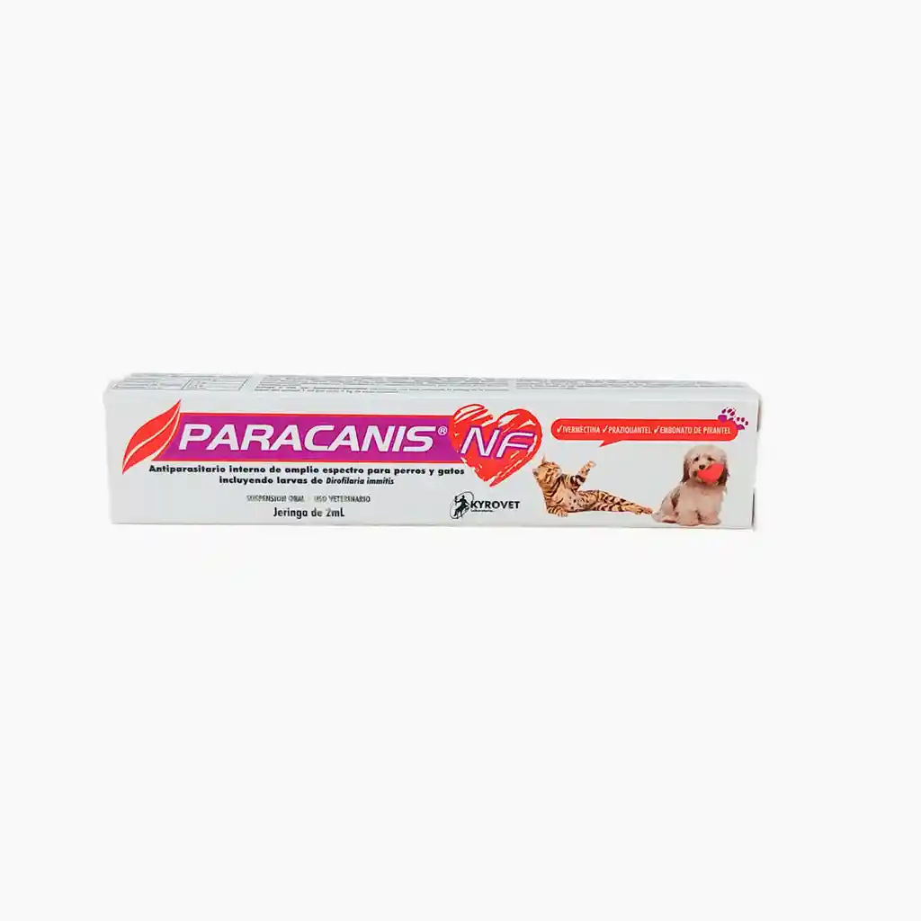 PARACANIS NF JGA X 2 ML Antiparasitario oral de amplio espectro para perros, ahora en una práctica presentación de 2 ml, ideal para tratamientos de menor duración o dosis individuales. Formulado con ivermectina, praziquantel y pirantel para combatir eficazmente nematodos y cestodos intestinales. Beneficios: Para qué mascotas aplica: Perros. Composición: Ivermectina, Praziquantel y Pirantel. Modo de uso: Administrar por vía oral según el peso del perro, siguiendo siempre las recomendaciones de un veterinario profesional.