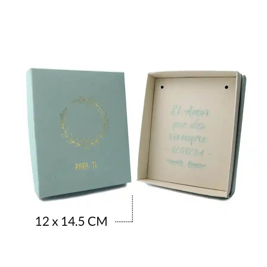 CAJA REGALO VERDE AGUAMARINA ESTAMPADA HOJA/ CORAZON 12X 14.5 CM / X UNIDAD
