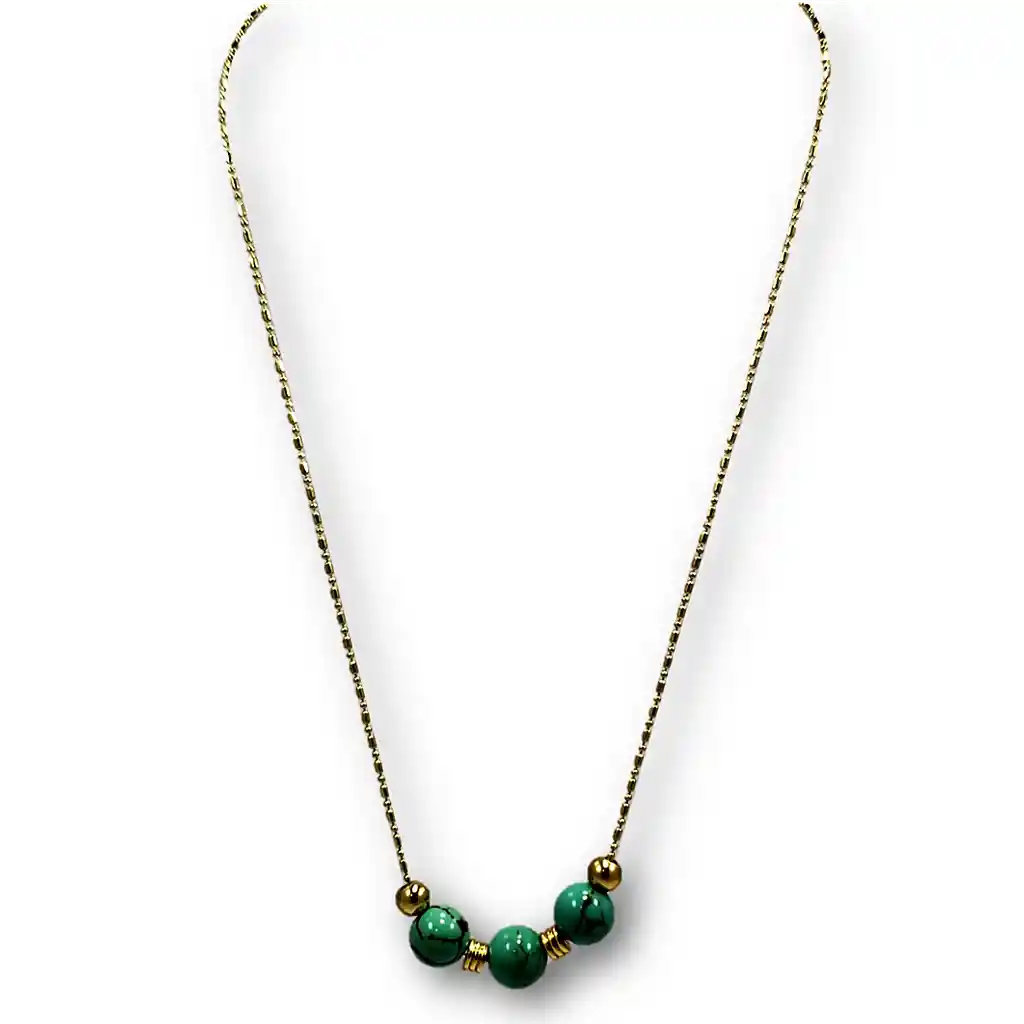 Collar elaborado artesanalmente en bronce con baño en oro de 18 quilates que integra en su diseño único, diferentes elementos que lo llenan de simbolismo. Es una pieza atemporal, que brinda múltiples oportunidades para combinarlo y sin dudarlo al momento de lucirlo no pasarás desapercibida; por el contrario, te hará brillar. Collar diseñado por Lynx Accesorios Largo Cadena: 42 cm Materiales: - Cadena en bronce con baño en oro brillante - Gemas: Turquesa veteada - Garantía de 30 días en acabados bajo condiciones normales de uso - Al ser una pieza ensamblada de forma artesanal el producto entregado puede presentar diferencias de colores y acabados al expuesto en la fotografía