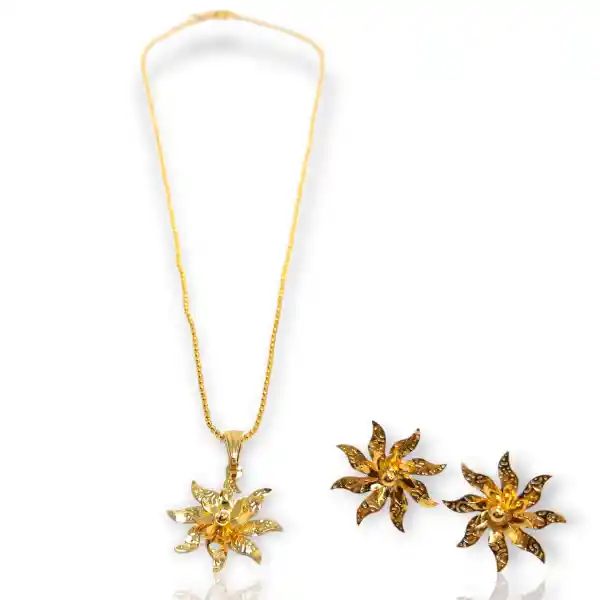 ¡Piezas únicas y autenticas! Este conjunto ofrece un estilo sencillo de collar y aretes adornados con dijes de lindo diseño. El look sencillo y atemporal de estas piezas hace que este conjunto sea ideal para complementar los atuendos de diario. Esta pieza es totalmente hecha a mano, desde su proceso de corte hasta sus acabados. Materiales: Bronce con baño en oro 18K brillante Medida: Collar: Cadena 42 cm de largo Aretes: 2.0 cm de diámetro Peso aproximado cada arete: 1.0 gramos - Garantía de 30 días en acabados bajo condiciones normales de uso - Al ser una pieza ensamblada de forma artesanal el producto entregado puede presentar diferencias de colores y acabados al expuesto en la fotografía