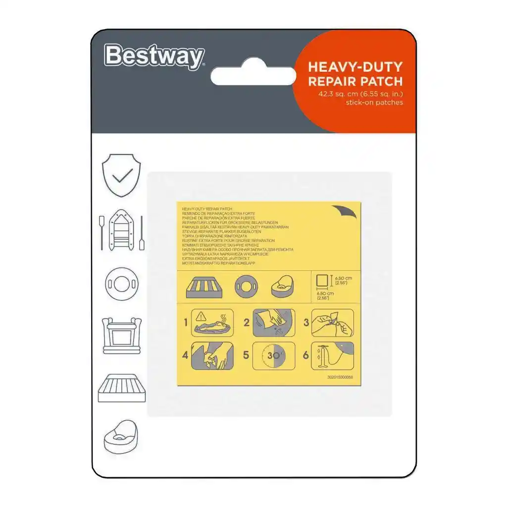 El parche de reparación de gran resistencia de Bestway® es una manera sencilla y rápida de reparar posibles perforaciones que puedan sufrir los productos hinchables. Los parches son ideales para reparar piscinas, hidromasajes y colchones hinchables. Bestway® garantiza que estos parches de reparación son resistentes al agua, lo que te permite solucionar problemas que se produzcan por debajo de la superficie del agua de tu piscina o hidromasaje. Para aplicar estos parches de reparación autoadhesivos, basta con limpiar previamente la zona dañada de tu hinchable, despegar la parte posterior del parche y adherirlo sobre la superficie deseada. Cuando lo hayas colocado, espera 30 minutos antes de volver a hinchar el producto. // Contenido del pack : 10 Parches de reparación de alta resistencia /// Ficha Técnica: Dimensiones: 6.5 cm x 6.5 cm ** _Para defectos de fábrica o retractos: \_Por favor revise el producto apenas lo reciba y antes de usarlo. No aplican ley de retracto o defectos de fábrica luego de usar el producto. Se manejan máximo 5 días para reportar defectos de fábrica (por ejemplo, producto funciona mal, piezas faltantes, rotas, etc). Para hacer efectiva la devolución el producto debe devolverse con el empaque original, el cual debe estar en buen estado, incluir todos los documentos y las partes completas y sin daños.