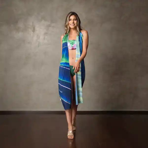 Pareo desarrollado a partir de fotografias de peces y plumas de papagayo, fabricado en poliéster suave y liviano. Medida 130cx 130 cm