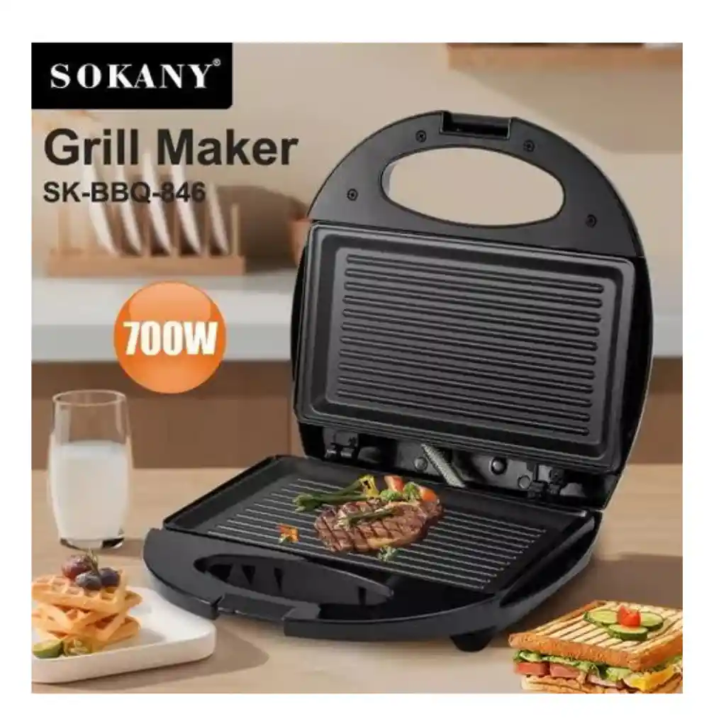 Parrilla Sokany BBQ-846 Prepara tus mas deliciosos platos y recetas con esta parrilla Sokany BBQ, hecha en acero inoxidable, fàcil de limpiar, cuenta con manija de bloqueo la seguridad de usuario y tiene pies antideslizantes que brindan estabilidad y agarre en superficies lisas. Caracterìsticas: Comidas calientes en minutos ¡Ahorre tiempo por la mañana y prepare deliciosos platos sabrosos de estilo restaurante en casa! Ideal para asar hamburguesas, bistecs y verduras, así como para hacer tortillas, tostadas francesas, atún y sándwiches. Simple y eficiente, ya que esta hecho de una carcasa de acero inoxidable resistente al calor y alimentado por un elemento de calentamiento rápido de 700 vatios que proporciona un tostado uniforme. La luz indicadora de encendido le permitirá saber cuándo la unidad está encendida, mientras que la luz de precalentamiento le permite saber cuándo está lista para cocinar. Limpieza sin problemas, gracias a su recubrimiento antiadherente garantiza la liberación de alimentos sin esfuerzo. Simplemente apáguelo, deje que se enfríe y limpie los platos con una esponja o una toalla empapada en agua tibia y jabón para eliminar cualquier aceite y comida restantes. Seguro y ergonómico, ya que la manija de bloqueo de tacto frío permite que el calor se disipe para un funcionamiento fácil y seguro, mientras que el control del termostato evita que sus alimentos se quemen y evita el sobrecalentamiento. Tiene pies antideslizantes que proporcionan estabilidad y agarre en superficies lisas.