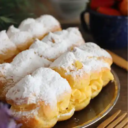 Biscocho en harina de avena, relleno de crema pastelera saludable con Stevia pulverizada por encima