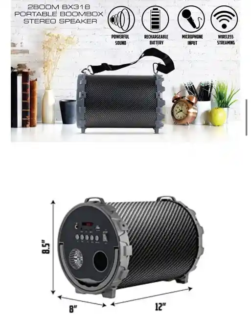 Potente sonido: disfruta de un sonido claro y graves fuertes con la unidad de controlador de 6.5 pulgadas y 20 W 3 ohmios de salida. Conexión inalámbrica: conecta el altavoz a cualquier dispositivo con Bluetooth de hasta 33 pies. Diseño portátil: utiliza el asa de transporte o conecta la correa incluida para llevar el altavoz sobre la marcha. Luces coloridas: las luces LCD cambian al ritmo de tu música. Entradas: USB, AUXILIAR, TARJETA TF, MICROPHONE.FM RADIO - Utiliza el cable auxiliar para convertir el altavoz en una radio y reproducir tus emisoras favoritas. HACER MÁS CON TU ALTAVOZ El BX318 es algo más que tu altavoz promedio - se puede utilizar para reproducir música de cualquier manera que desees, escuchar la radio o como un sistema de PA