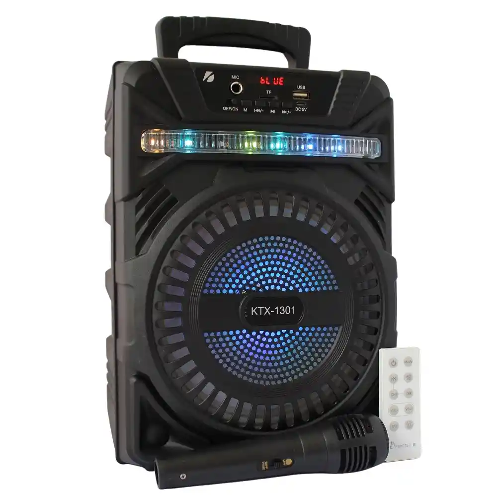 Espectacular oferta de sonido portátil, este hermoso parlante de sonido de alta fidelización, tiene la facilidad de reproducir por Bluetooth, USB, Micro SD Y FM Radio, con entrada Auxiliar, tiene todas las funciones y lo puedes transportar sin problemas, el parlante trae batería de Litio de alta duración para que puedas armar las fiestas donde quieras o para que puedas hacer KARAOKE o lo que se le pueda ocurrir en cualquier lugar, el parlante tiene una pantalla digital Características destacadas Potente alto parlante con radio FM y reproductor MP3. Reproduce USB y tarjeta TF Sonido potente Luces Tipo Discoteca Potencia 10 Watt Bateria de Lithium de larga duración Conexión bluetooth Entrada para Microfono Entrada DC: 5 V Medidas 30 cm de Alto x 21 cm de Ancho x 14 cm de Profundidad