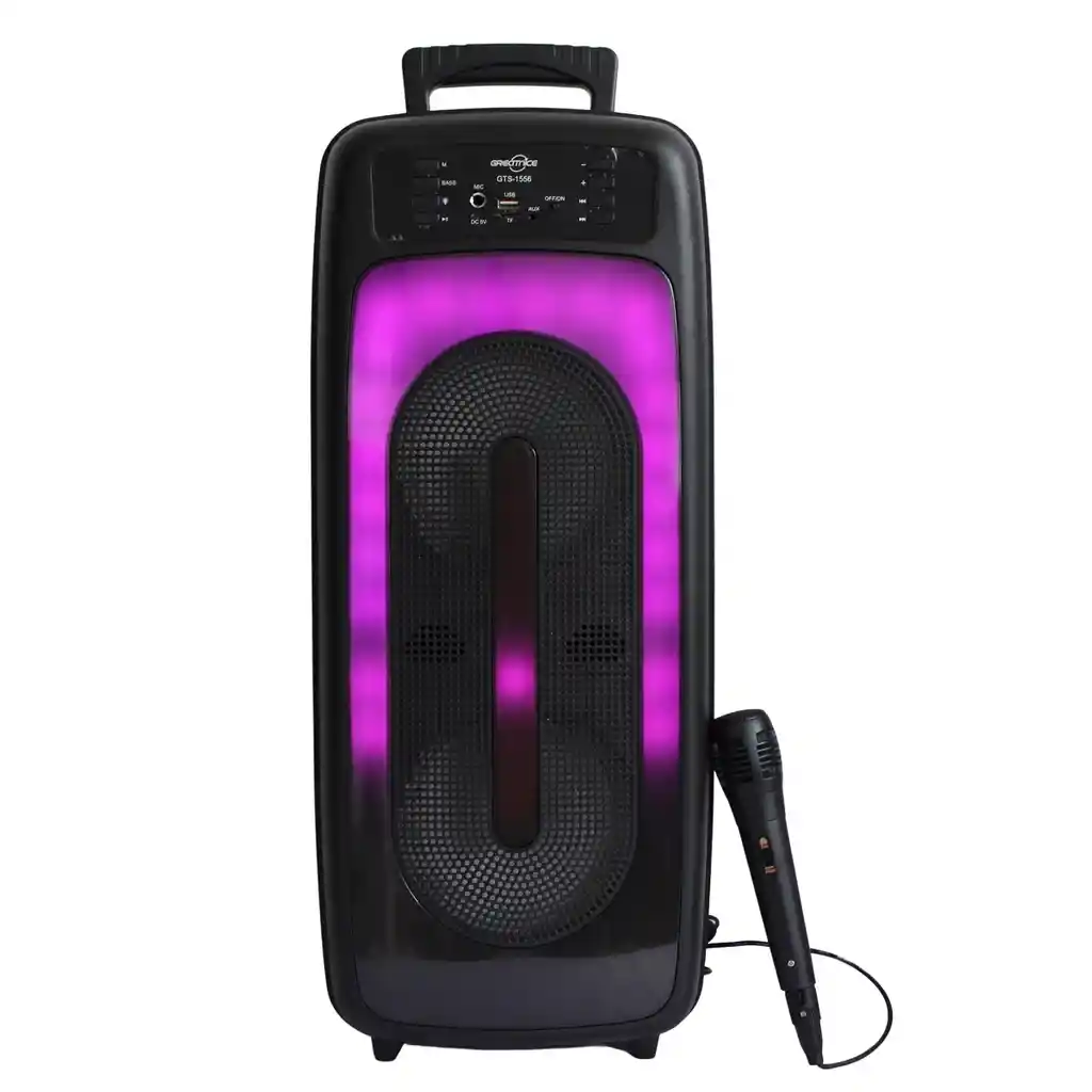 Bocina portátil de 6.5 pulgadas con luz LED al encender, se conecta por medio de bluetooth, USB, micro SD, Auxiliar 3.5 mm. y entrada para micrófono. Tiene un rango de alcance de aproximadamente 10 metros. Radio FM. Su batería es recargable y tiene una duración de 4 horas continuas, incluye un cable de carga, micrófono alámbrico. DETALLES Bocina Bluetooth 6.5″ x2 Radio FM Iluminación LED Batería recargable Incluye cable V8 y micrófono alámbrico **INFORMACIÓN IMPORTANTE **El color de la foto es referencial para que puedas ver los atributos del producto y al mismo tiempo es la opción 1 nuestra de despacho. Pero dejamos la aclaración para que lo tengas presente por si te llegara en otro color.**