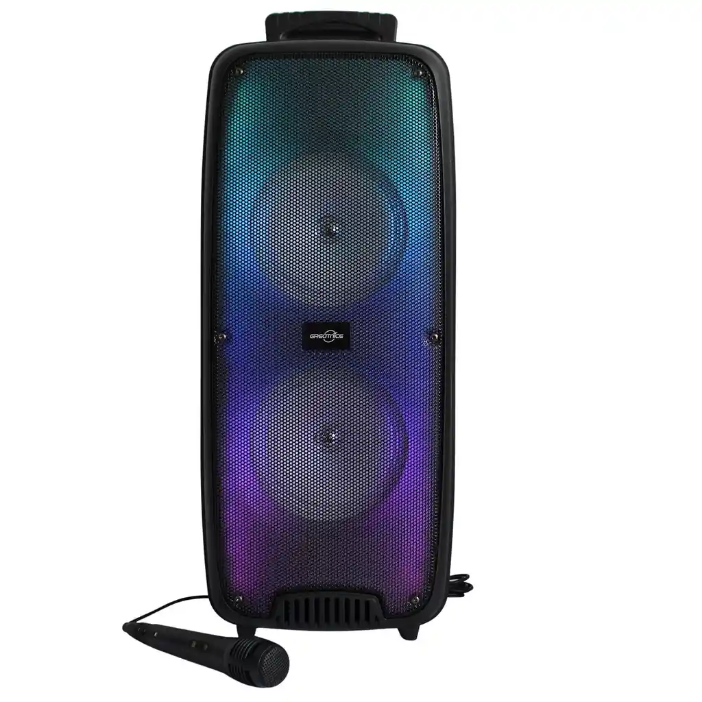 Bocina portátil de 6.5 pulgadas con luz LED al encender, se conecta por medio de bluetooth, USB, micro SD, Auxiliar 3.5 mm. y entrada para micrófono. Tiene un rango de alcance de aproximadamente 10 metros. Radio FM. Su batería es recargable y tiene una duración de 4 horas continuas, incluye un cable de carga, micrófono alámbrico. DETALLES Bocina Bluetooth 6.5″ x2 Radio FM Iluminación LED Batería recargable Incluye cable V8 y micrófono alámbrico **INFORMACIÓN IMPORTANTE **El color de la foto es referencial para que puedas ver los atributos del producto y al mismo tiempo es la opción 1 nuestra de despacho. Pero dejamos la aclaración para que lo tengas presente por si te llegara en otro color.**