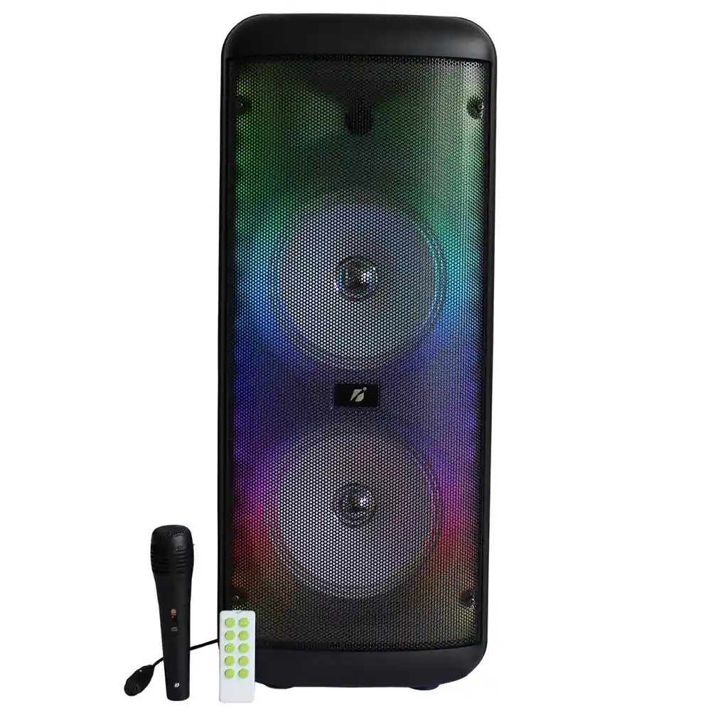 Esta bocina con Bluetooth potente tiene un diseño extremadamente elegante con LED RGB. Aumenta el volumen y siente la potencia de ese modelo. Escucha un sonido limpio y llamativo gracias al ecualización sin costuras de 2 altavoces de 8 pulgadas que ofrece hasta 20W x 2, con un rendimiento elusivo. Conecta cualquier dispositivo de conexión inalámbrica a través de Bluetooth, tarjeta SD, entrada USB, micrófono con cable y radio FM. DETALLES Transmisión inalámbrica: hasta 10 metros Tamaño de la unidad altavoz alto: 2x8 pulgadas + 10W tweeter Respuesta de frecuencia: 100Hz-20kHz Señal/ruido de la interfaz: = 85dB FM: 87,5-108,0 MHz Carga USB: DC5V Capacidad de la batería: 2400mAh Admite memoria máxima (USB/SD): 32GB Tiempo de reproducción: hasta 1 hora con volumen 75% tiempo de carga: 3 horas Tamaño del producto: 26 6X26 1 cm X65 cm **INFORMACIÓN IMPORTANTE **El color de la foto es referencial para que puedas ver los atributos del producto y al mismo tiempo es la opción 1 nuestra de despacho. Pero dejamos la aclaración para que lo tengas presente por si te llegara en otro color.**