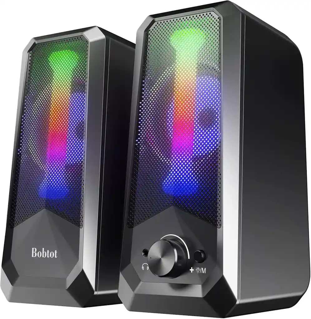 Calidad de sonido de alta fidelidad: el altavoz Bobtot para computadora se combina con un núcleo estéreo mejorado de 2.0 canales con unidad de doble unidad grande de 5 W x 2, hasta 10 W de salida, puedes disfrutar de los graves profundos y el ambiente envolvente fácilmente.