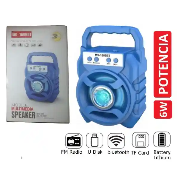 Conexión bluetooth e incluye cable usb sd ● Reproduce sd ● Entrada memoria usb ● Entrada aux in ● Radio fm ● Batería de litio recargable incorporada ●Color: Azul ● Marca: MS ● Salida De Potencia: 6W● Luces Led. ● Dimensiones Alto: 14cm x Ancho: 10cm x Largo: 10cm ● Peso: 350