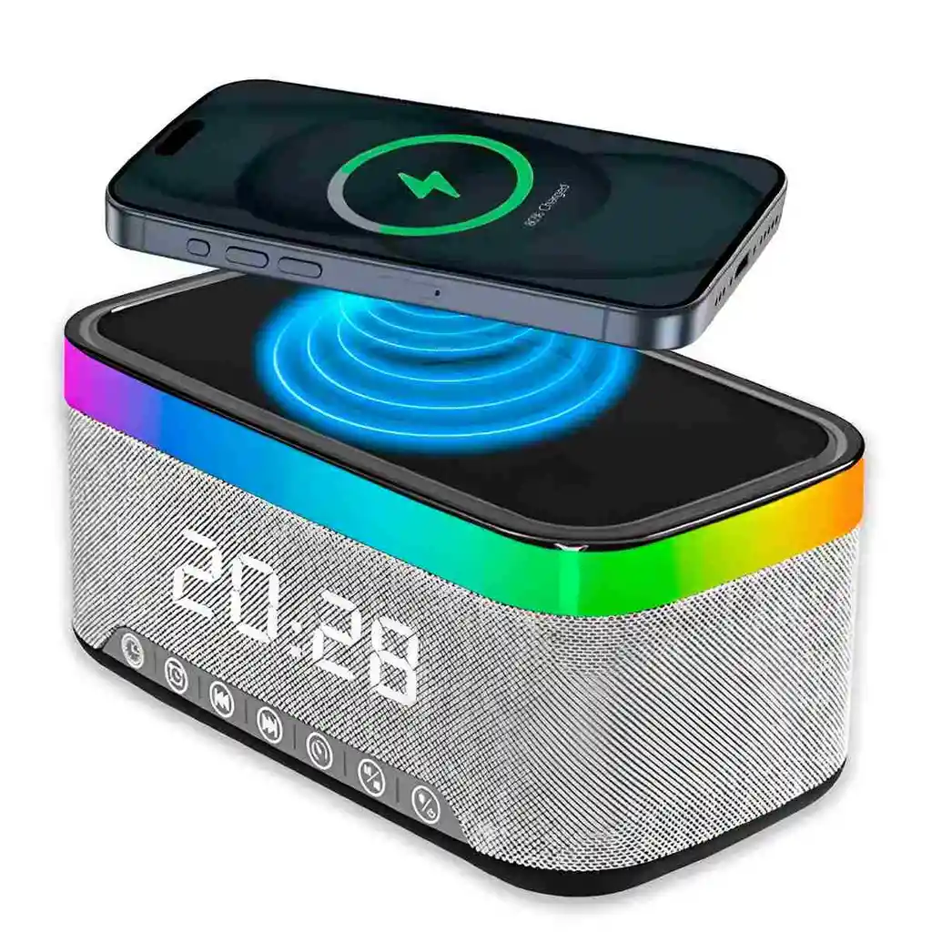 Optimiza tu mesa de noche con este innovador dispositivo 4 en 1 que combina un potente altavoz Bluetooth 5.3, un cargador inalámbrico de carga rápida de 15W, reloj despertador y una envolvente lámpara LED RGB. Este centro de entretenimiento y utilidad destaca por su diseño elegante con acabado en tela y una franja de luz multicolor ajustable que crea el ambiente perfecto para descansar o trabajar. Gracias a su avanzada tecnología inalámbrica, podrás cargar tu smartphone compatible simplemente colocándolo sobre la base superior, mientras disfrutas de un sonido nítido de alta fidelidad con una salida de 15W. Equipado con una batería de larga duración de 1800 mAh y una pantalla digital de fácil lectura, es el accesorio ideal para mantener tu espacio organizado, cargado y siempre al ritmo de tu música favorita. Ficha técnica Modelo: KP-559 Versión inalámbrica: Bluetooth BT5.3 Alcance de la transmisión: 10 metros Potencia de salida: 15W Especificaciones de la batería: 1800 mAh integrada Tensión de carga: DC 5V Rango de respuesta de frecuencia: 20Hz a 20kHz Tamaño del producto: 180 mm x 100 mm x 90 mm Peso del producto: 820 g Funciones: Cargador inalámbrico Qi, Reloj Despertador, Luz LED RGB, Reproductor de música Compatibilidad: Smartphones con tecnología de carga inalámbrica Material: Estructura reforzada con acabado textil y panel digital Políticas de garantía La garantía de este producto es de 30 días calendario y cubre exclusivamente defectos de fabricación o fallas técnicas en los componentes electrónicos, el sistema de carga inalámbrica o la conectividad Bluetooth bajo condiciones de uso normal. No se aplicará garantía por daños físicos derivados de golpes, caídas, exposición a la humedad o líquidos, ni por daños eléctricos causados por el uso de cargadores de pared que no cumplan con la tensión especificada de 5V. Para tramitar cualquier reclamación, es indispensable que el producto sea devuelto en su empaque original en perfecto estado, con todos sus accesorios incluidos y sin señales de haber sido manipulado internamente o presentar desgaste excesivo por uso inadecuado.
