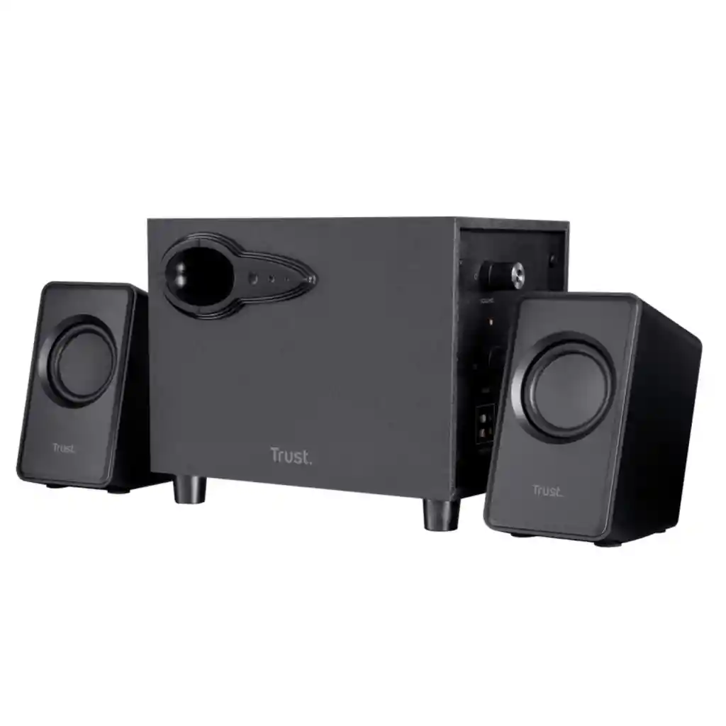 Conjunto de altavoces compactos con subwoofer y alimentación por USB 2.1 con subwoofer de madera, para ordenadores de sobremesa y portátiles, Potencia máxima de 18 W (RMS de 9 W)Tamaño compactoSubwoofer con control de volumen y bajos en el panel lateralAlimentación por USB: sin necesidad de conexión a enchufe de pared