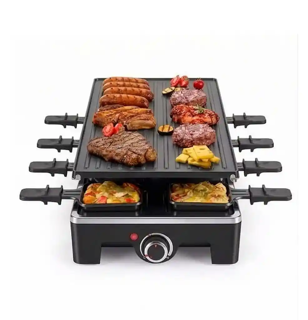 Esta espectacular parrilla eléctrica tipo Raclette de 1600W es el aliado definitivo para tus reuniones sociales y cenas familiares, diseñada para ofrecer una experiencia culinaria interactiva y versátil en un solo dispositivo. Gracias a su innovador sistema de dos niveles, permite asar carnes, embutidos y vegetales en la plancha superior con acabado tipo grill, mientras que en su nivel inferior puedes fundir quesos o calentar guarniciones utilizando sus 8 bandejas individuales antiadherentes. Equipada con un control de temperatura ajustable y un elemento calefactor de alta potencia, garantiza una cocción rápida y uniforme en toda la superficie, mientras que su diseño desmontable facilita una limpieza profunda en minutos. Es la solución ideal para quienes buscan practicidad, elegancia y la posibilidad de preparar múltiples alimentos simultáneamente, transformando cualquier comida en un evento gourmet inolvidable desde la comodidad de su mesa. FICHA TÉCNICA Producto: Parrilla Eléctrica Tipo Raclette Multifuncional Capacidad: Ideal para 8 personas simultáneamente Potencia: 1600W (Calentamiento rápido y constante) Voltaje: 110V - 120V (Uso doméstico estándar) Frecuencia: 60Hz Niveles de cocción: 2 niveles independientes Material de la placa superior: Metal con recubrimiento antiadherente de alta calidad Tipo de superficie superior: Ranurada tipo Grill para marcar carnes Accesorios incluidos: 8 Mini bandejas (sartenes) con mangos aislantes Control de temperatura: Perilla giratoria ajustable con luz indicadora Dimensiones del producto: 48 cm (Largo) x 22 cm (Ancho) x 15 cm (Alto) Dimensiones de mini bandejas: 21 cm (Largo total con mango) x 10 cm (Ancho de la base) Características adicionales: Placa superior removible, base estable y diseño de fácil limpieza Garantía: 1 mes por defectos de fábrica POLÍTICA DE GARANTÍA Y RETRACTO Este producto cuenta con 1 mes de garantía por defectos de fábrica (fallas en el sistema de calentamiento o materiales defectuosos); por favor revise el equipo al recibirlo, ya que no aplica retracto ni garantía tras su uso debido a que es un artículo de manipulación de alimentos. Dispone de máximo 5 días para reportar novedades (piezas faltantes o daños de transporte). Para cualquier devolución por garantía, es indispensable entregar el producto en su empaque original en buen estado, con todas sus piezas y manuales completos.