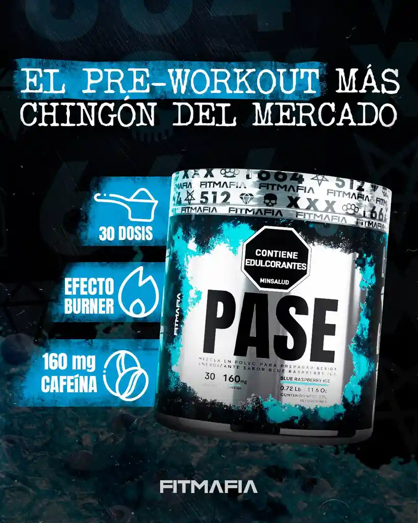 PASE 30 Servicios sabor Blue Raspberry Ice Descripción Pase es una mezcla en polvo para preparar bebida energizante, con un delicioso y refrescante sabor a (Blue Raspberry Ice y Fruit Punch), por sus componentes de cafeína, extracto vegetal de té verde y extracto de naranja amarga, es una combinación que logra mejorar tus niveles de energía y con un plan de entrenamiento adecuado ayudara a obtener tus objetivos en la medida de tu composición corporal. Contenido elevado en cafeína (32 mg/100 mL). No se recomienda el consumo de bebidas energizantes con bebidas alcohólicas. No recomendado para personas sensibles a la cafeína. Este producto solo podrá ser comercializado, expendido y dirigido a población mayor de 14 años Contenido: Neto 330g / 0.72 Lb / 11.6 Oz. Servicios: 30 Porciones por envase. Sabor: Blue Raspberry Ice Modo de Preparación: Mezclar 1 cuchara medidora (11 g) incluida en el empaque del producto en 2.5 vasos de agua (500mL) de agua, agítese hasta obtener un producto homogéneo. Consúmase una vez preparado.
