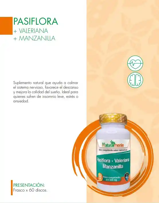 Suplemento natural que ayuda a calmar el sistema nervioso, favorece el descanso y mejora la calidad del sueño. Ideal para quienes sufren de insomnio leve, estrés o ansiedad.