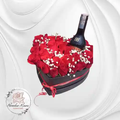 Una fusión de elegancia Pasión Brindis, contiene 1 Caja en forma de corazón mas 4 docenas de rosas rojas, 1 botella de Baileys 375 ml. Nota personalizada escribirla en el chat. El detalle perfecto para conquistar, aniversario o reconciliación.