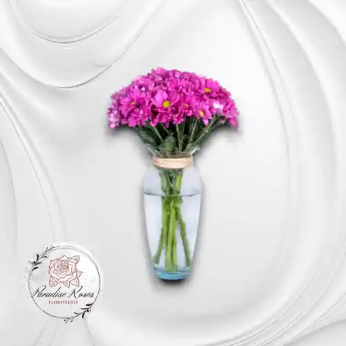florero de vidrio con margaritas o popom violeta, Ideal para sorprender, regalar amistad, celebrar momentos especiales o decorar con un estilo juvenil y colorido.