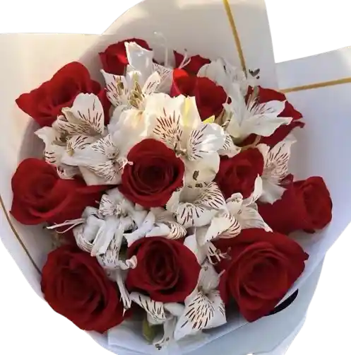 Un bouquet impactante de rosas rojas y flores blancas que crea un contraste sofisticado y lleno de emoción. Flores frescas de calidad premium, seleccionadas y armadas profesionalmente para un diseño abundante y armonioso. Algunas flores pueden variar según la disponibilidad de temporada, manteniendo siempre la estética y el valor del arreglo. Incluye tarjeta personalizada sin costo adicional.