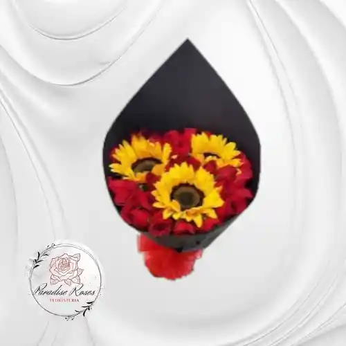 Elegante bouquet que mezcla la intensidad de 24 rosas rojas con la alegría de 3 girasoles, ideal para ocasiones como: Aniversarios, Regalo romántico, San Valentín.