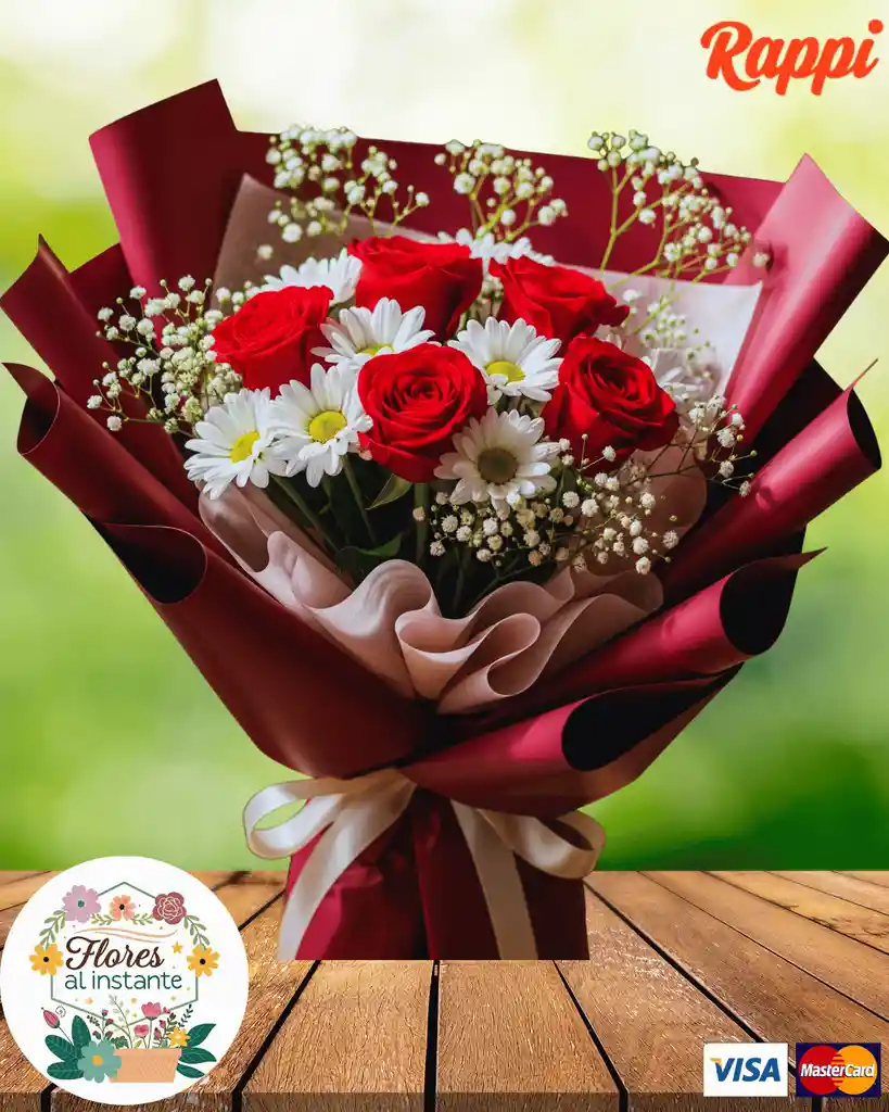 Un bouquet lleno de pasión y elegancia. Envuelto en un sofisticado papel coreano vinotinto, este arreglo combina la intensidad de 6 rosas rojas con la pureza de 5 margaritas blancas. La gipsófila y el follaje de rusco le dan un toque extra de frescura, creando una combinación armoniosa y romántica.
