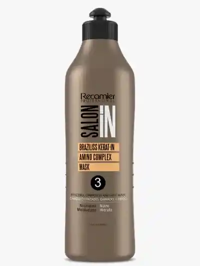 Paso 3 del proceso Braziliss de Salon In. Es un tratamiento reestructurante especialmente formulado con keratina, aminoácidos y aceites naturales para cerrar la cutícula, nutrir e hidratar el cabello luego del uso de Braziliss Kerat-IN Amino Complex Treatment. Paso #3 del proceso completo Braziliss de Salon IN