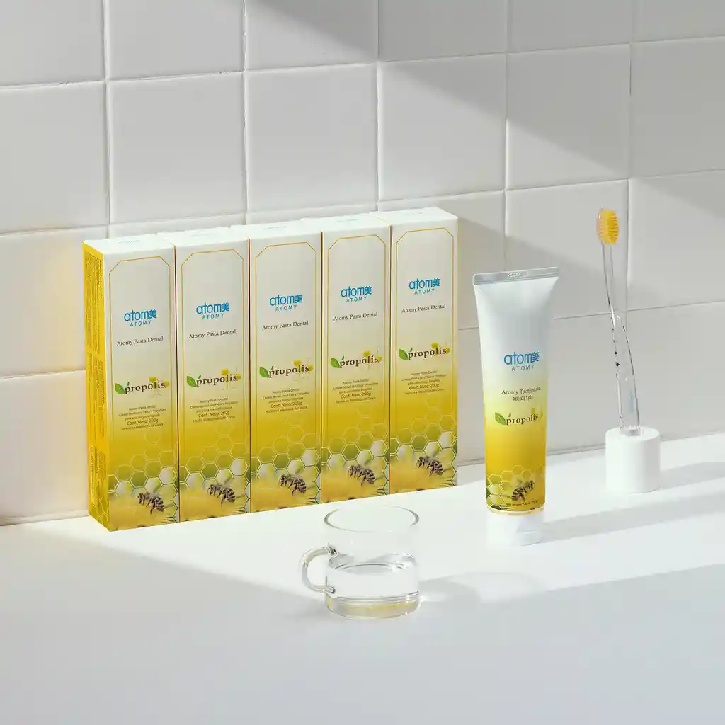 Descubre la Pasta Dental con Propóleo Atomy de 200 gramos, una fórmula coreana innovadora que combina ingredientes naturales y ciencia para una higiene bucal completa. El propóleo, conocido por sus propiedades antibacterianas y antiinflamatorias, protege tus encías y reduce la placa, mientras que el extracto de té verde refresca tu aliento y combate las caries. Su complejo fluorado fortalece el esmalte dental, brindándote una sonrisa más sana y radiante. Disfruta de una sensación de frescura duradera y un aliento agradable con esta pasta dental de uso diario, ideal para toda la familia. Protección integral: Combate caries, placa y mal aliento. Ingredientes naturales: Propóleo y extracto de té verde para un cuidado suave y eficaz. Aliento fresco: Aceite de naranja y fragancia cítrica para una sensación duradera. Fortalece el esmalte: Complejo fluorado para una mayor protección contra las caries.